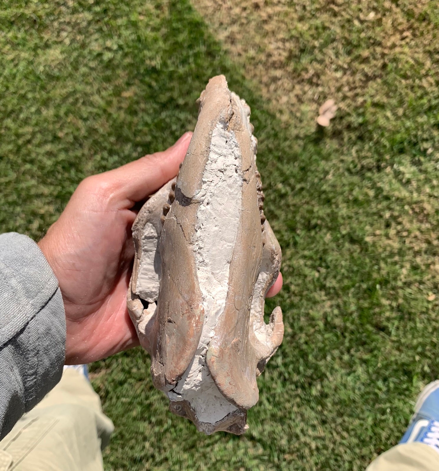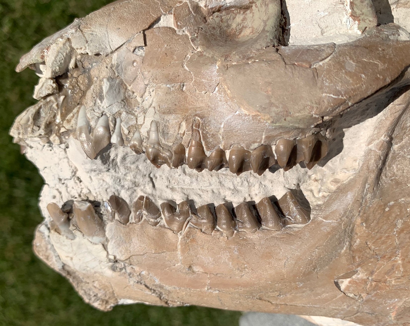 Nice oreodont skull with lower jaws from the white river formation of Sioux County Nebraska. There was some restoration done to this fossil skull. There areas outlined in red, show the areas that were restored or touched up