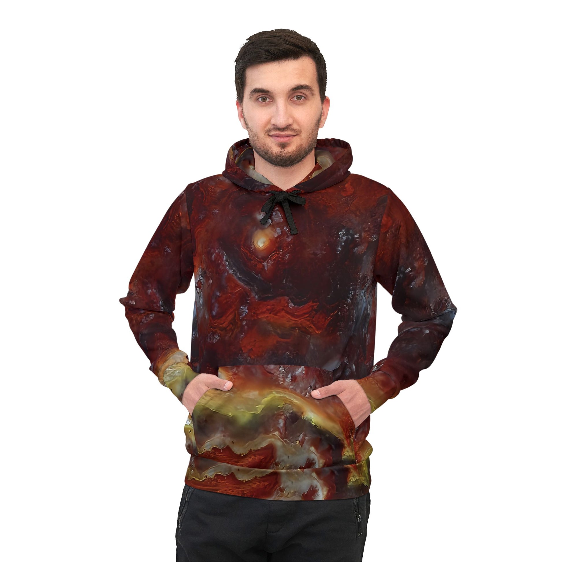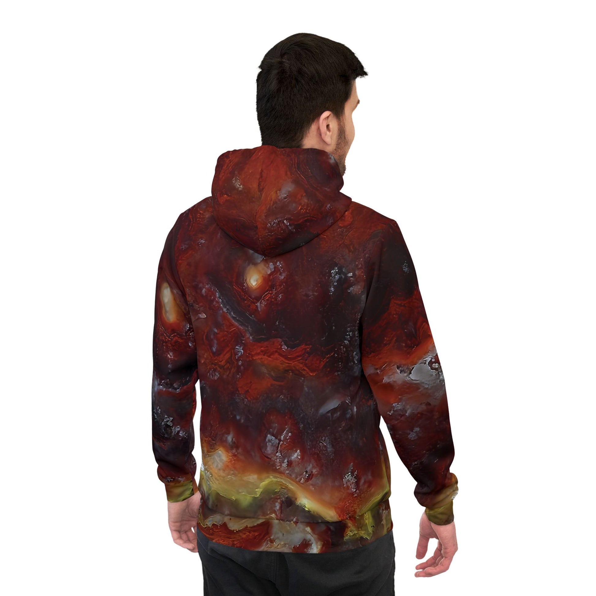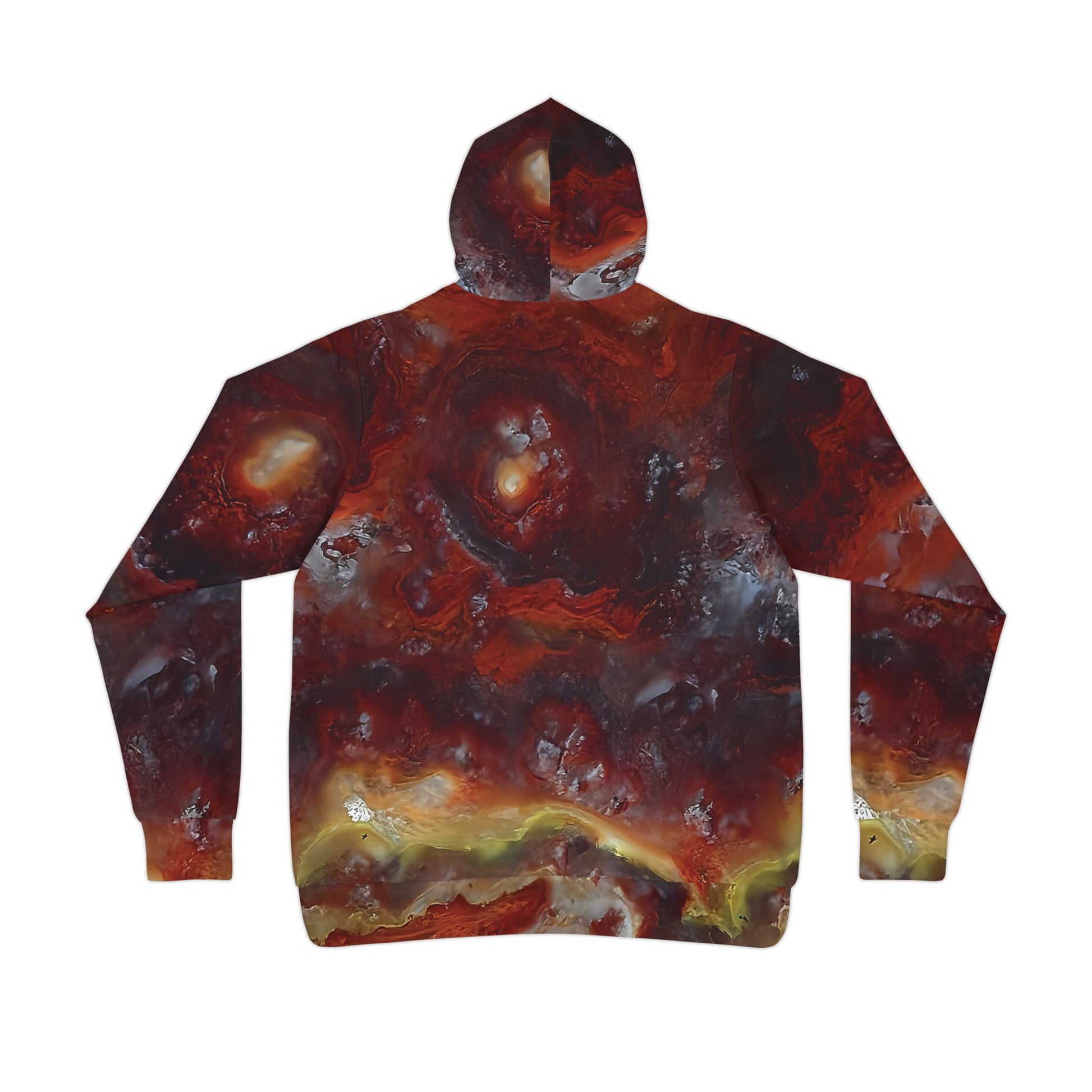 Introducing our stunning rock art hoodies, featuring the unique and colorful patterns of some wildfire hyalite bubble opal. These designs are created from high-resolution photographs of actual minerals, resulting in a look that transcends the traditional tie-dye look. With it's red, yellow and white colors, this hoodie is an essential addition to your artistic wardrobe!
